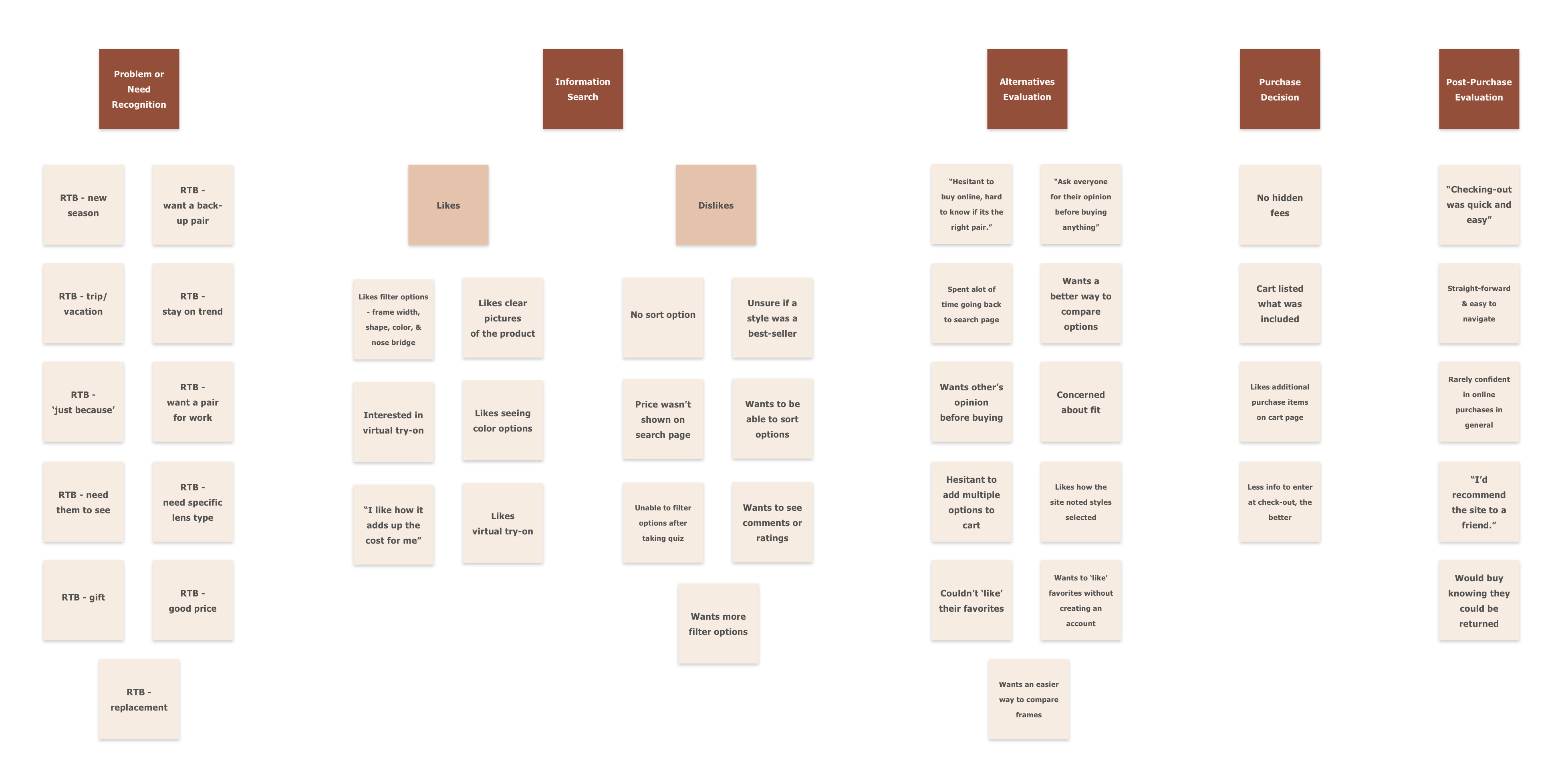 After breaking out my findings onto post-its, I grouped them by interviewee and then regrouped them into categories based on the consumer buying process: