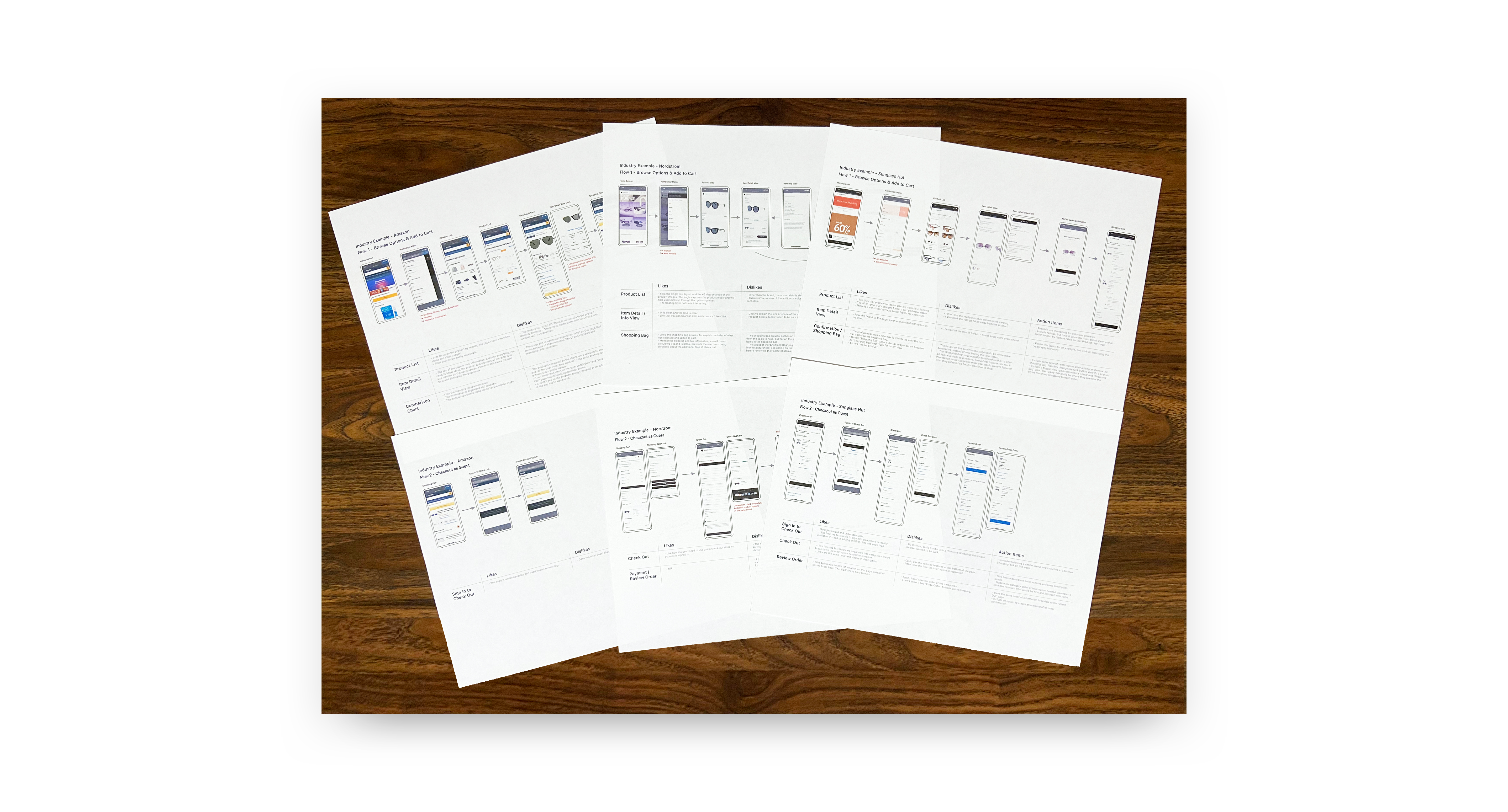 I evaluated three companies that have an e-commerce mobile website to see how industry leaders have approached similar problems and achieved similar business goals. This would then help lay down the foundation for my own approach and design layout.