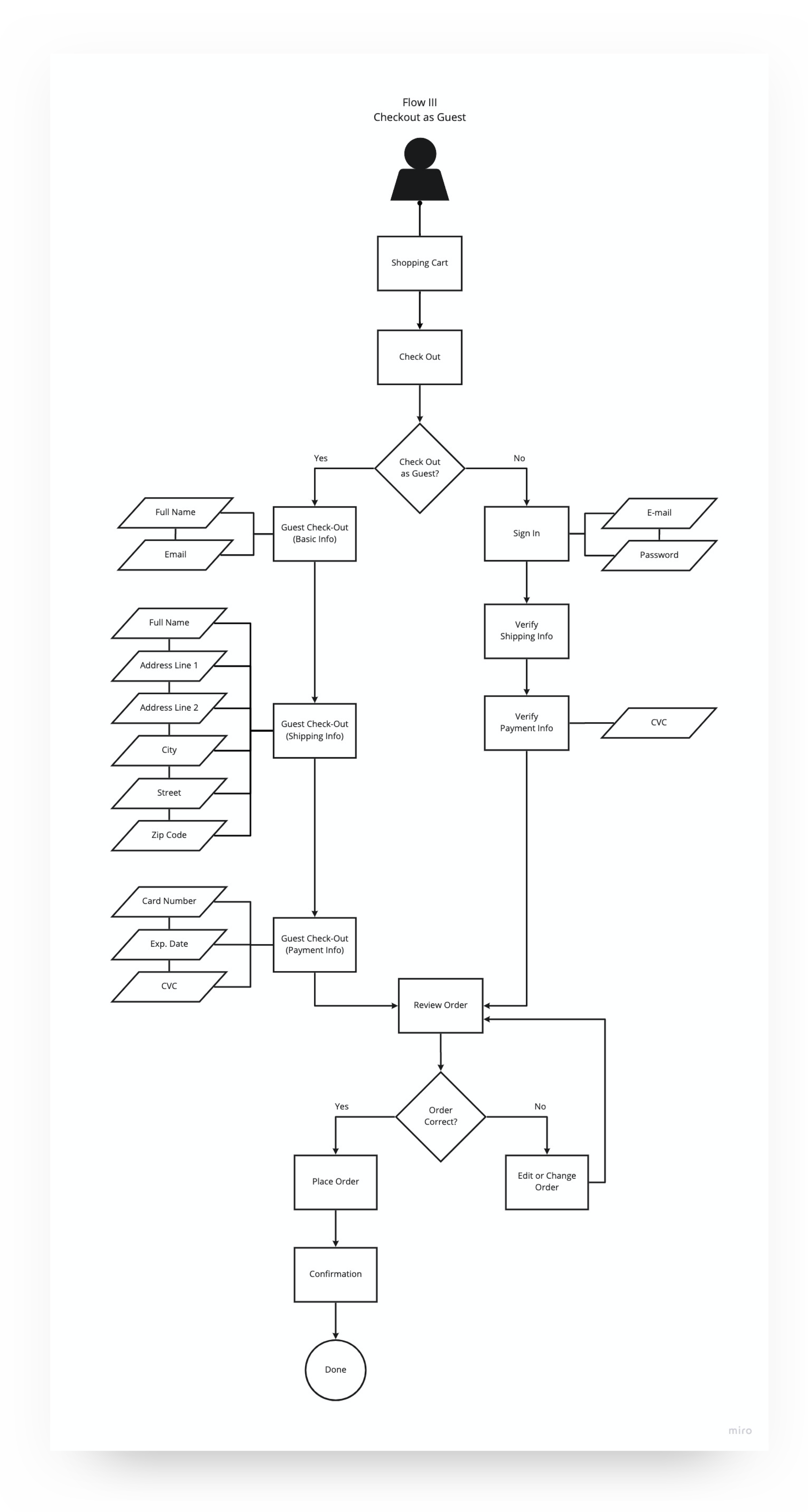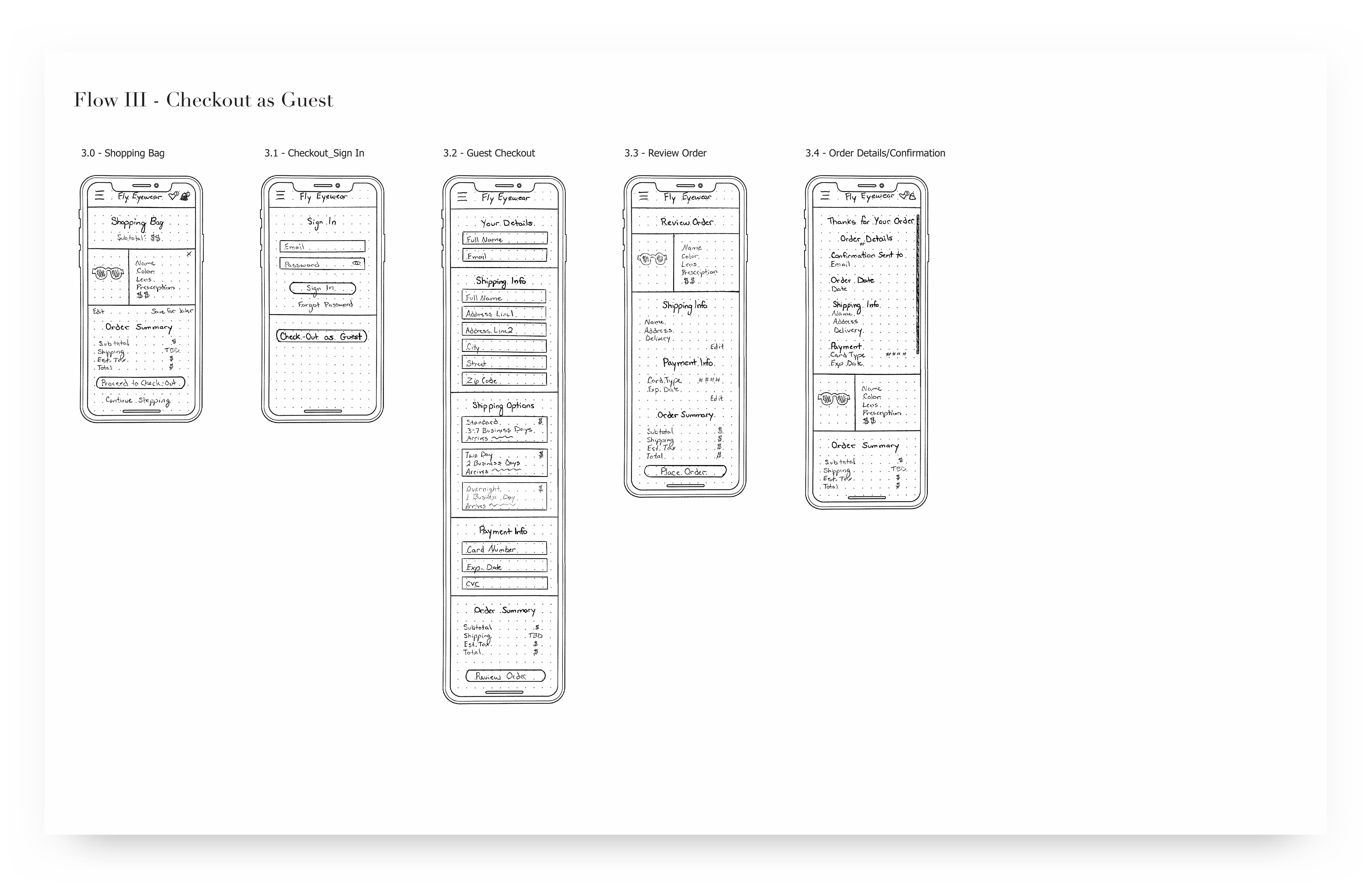 This flow begins on the shopping bag page with a product ready to purchase. The user is given the option to either sign in or checkout as a guest. After selecting guest, they are asked to enter their name and email, shipping information, payment information, and then select a shipping option. Once their correct information is entered, the user is asked to review their order and confirm. The last page is an order confirmation listing the order details.