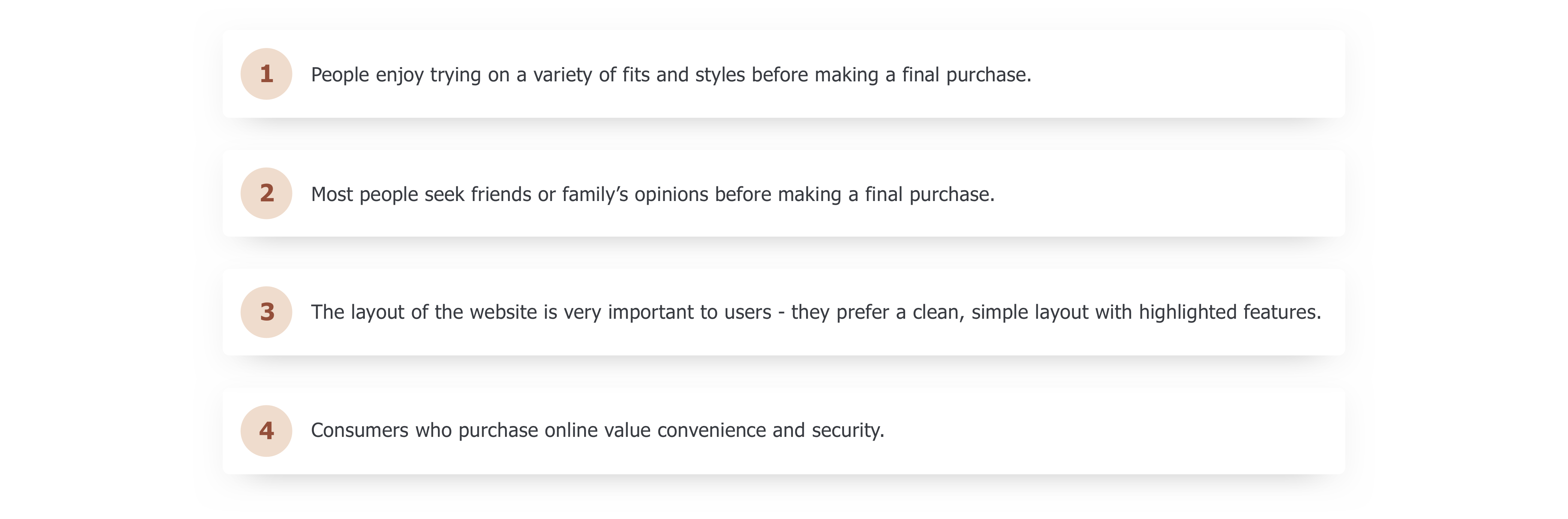 Customers run the risk of having size and fit issues when ordering online. They are limited in options and are at a disadvantage if the style they ordered is not as expected. Some customers also depend on receiving feedback from professionals or a companion during their shopping trip.