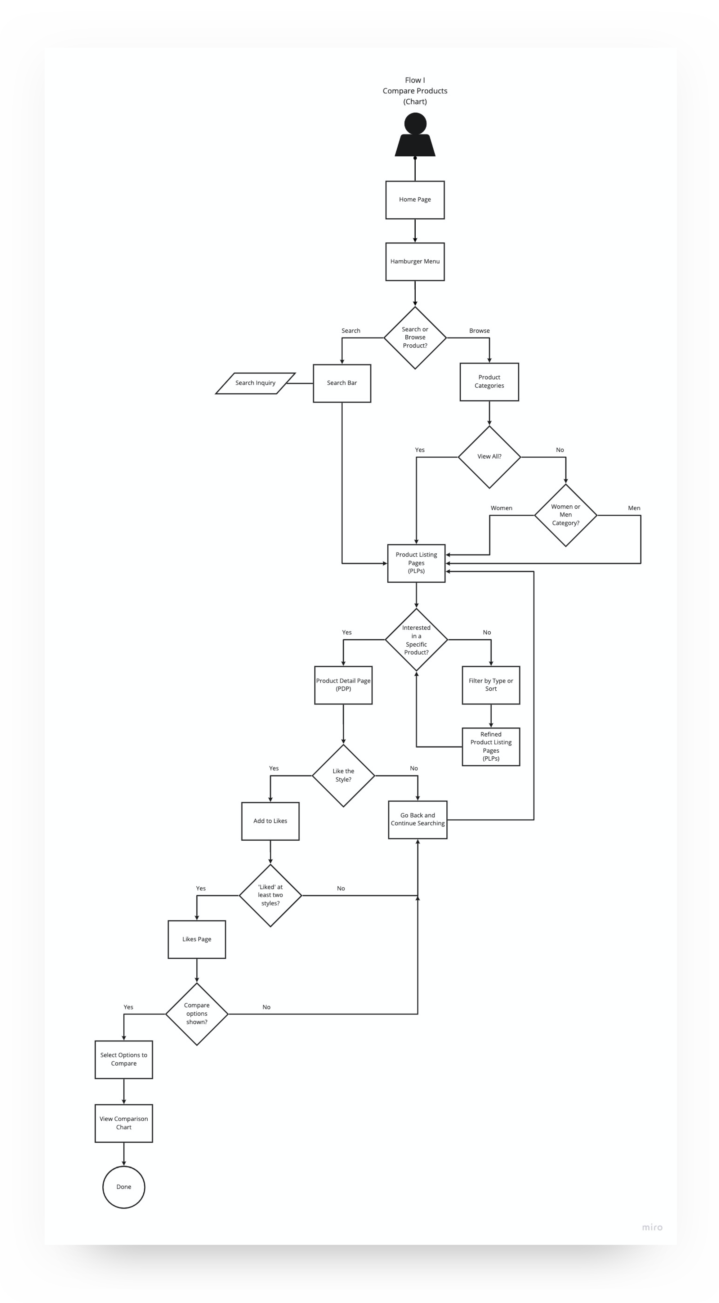 After vetting through my research, I brainstormed how to approach my problems and created user flows for my solutions. I decided to explore two options for comparing products and one for shopping bag abandonment.