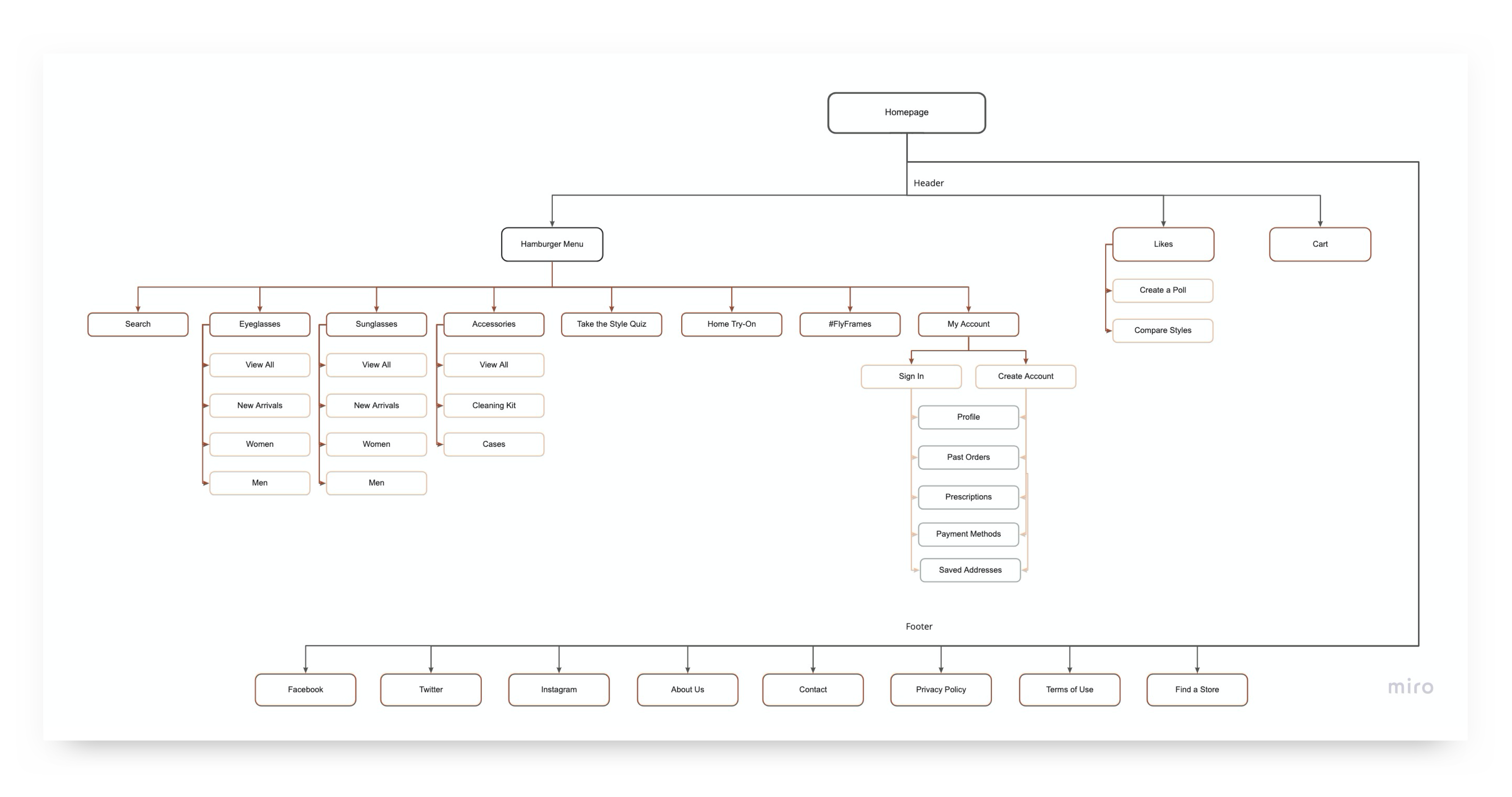 I kicked off my design stage by creating a map to visualize the architecture of the mobile-site. I incorporated a hamburger menu on the home screen to avoid visual clutter, and plan to hide the sub-categories in an accordion to minimize cognitive load.