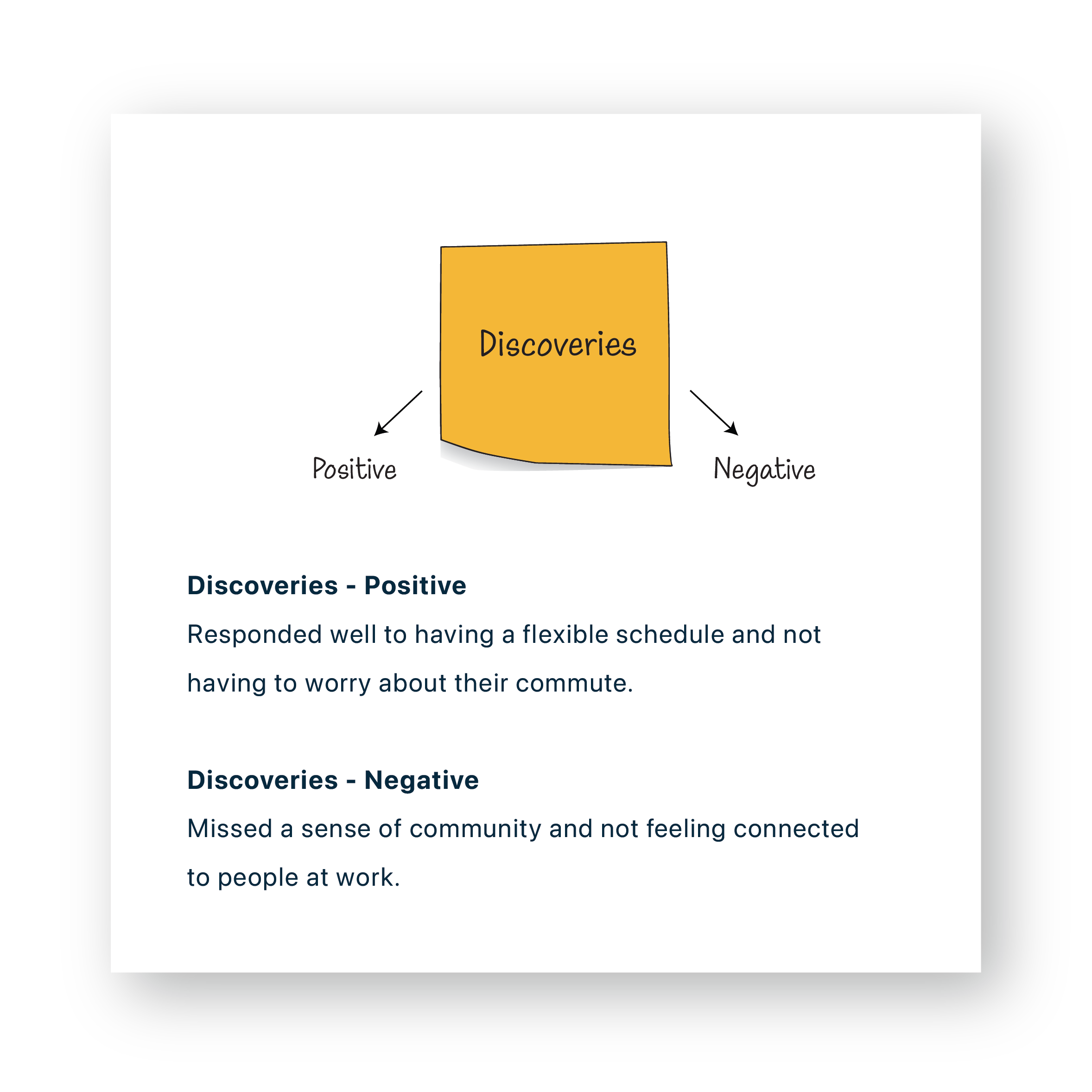 Within discoveries, the group was split between two sub-categories – Positive and Negative. By splitting these two up, I saw what problems I could attempt to address in my solutions.