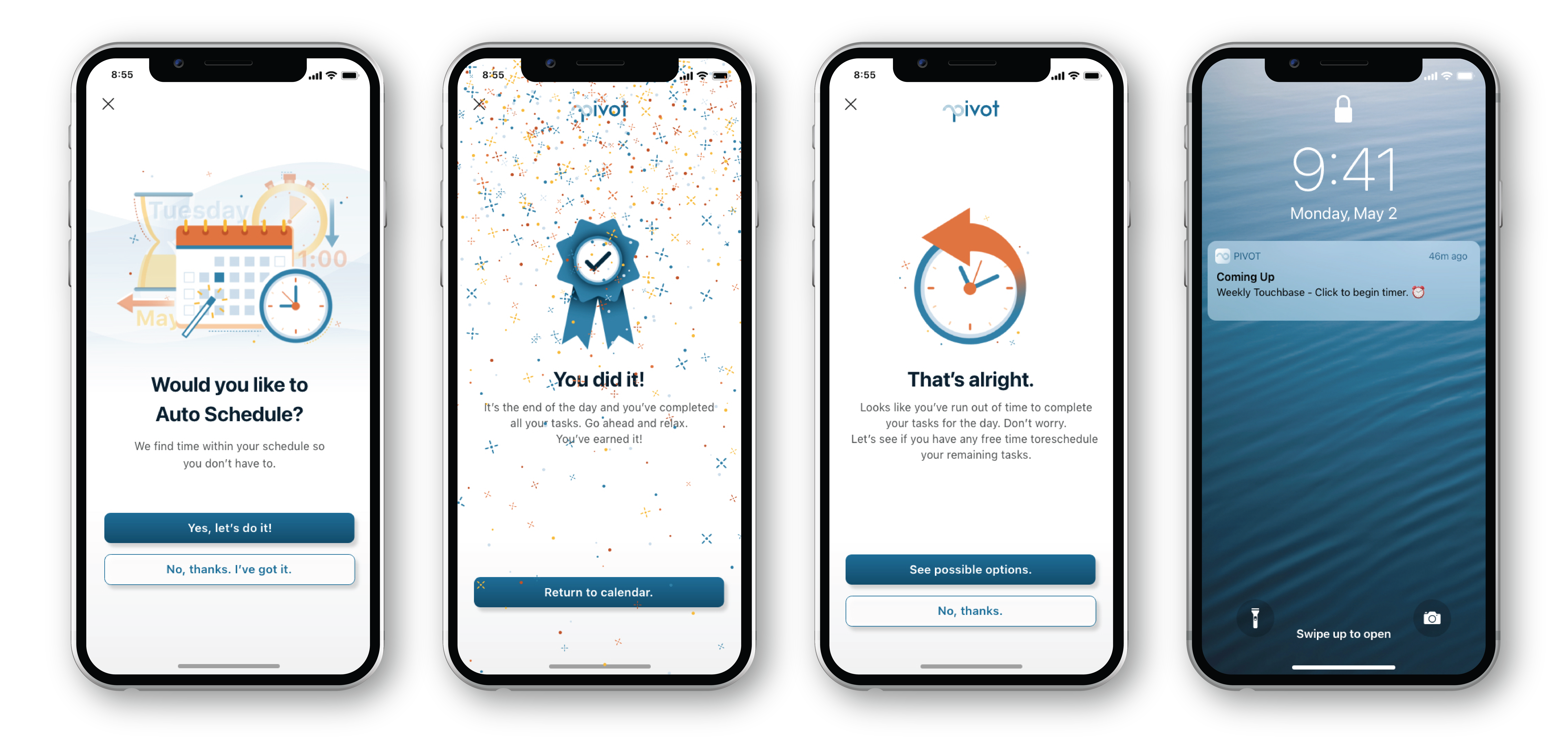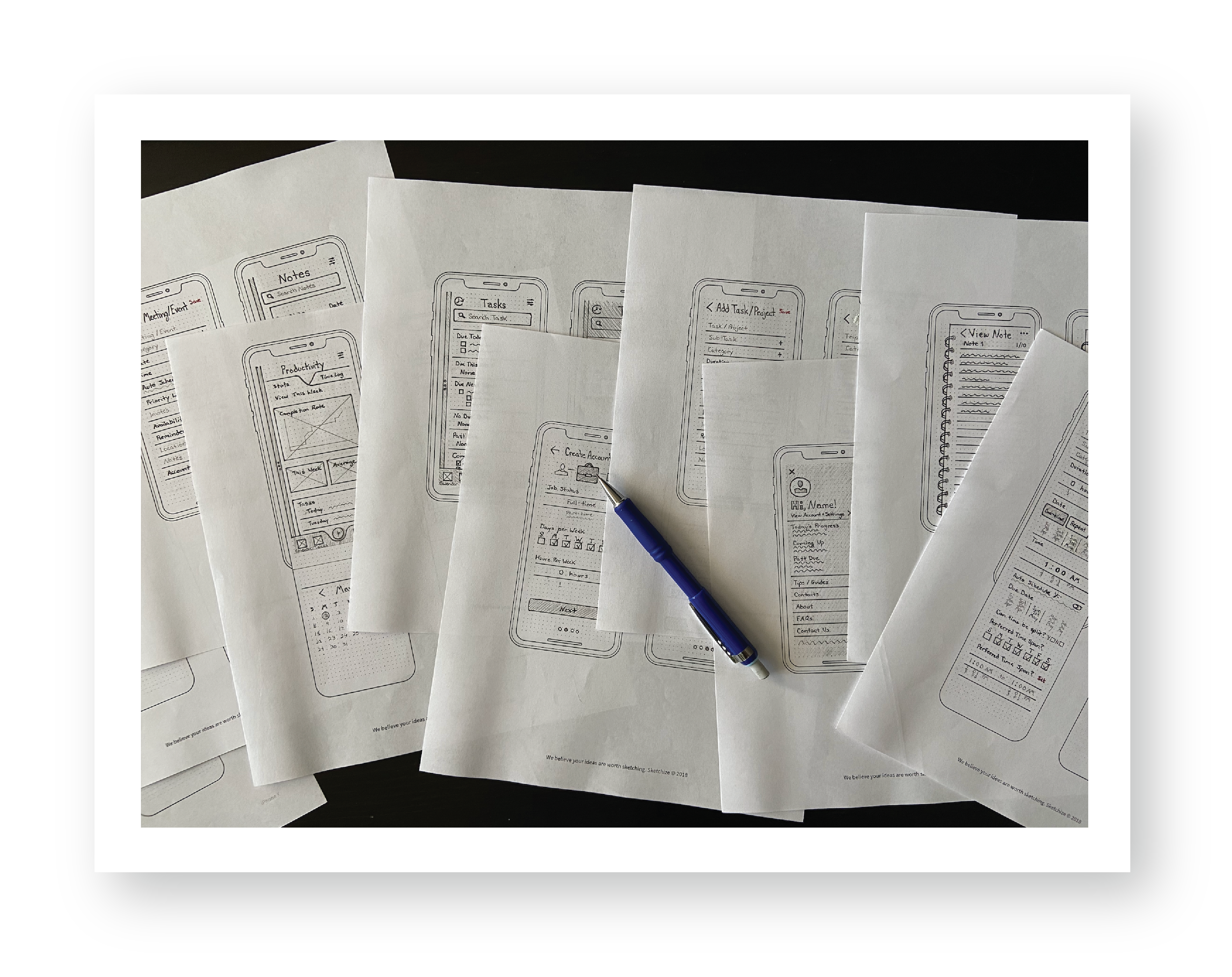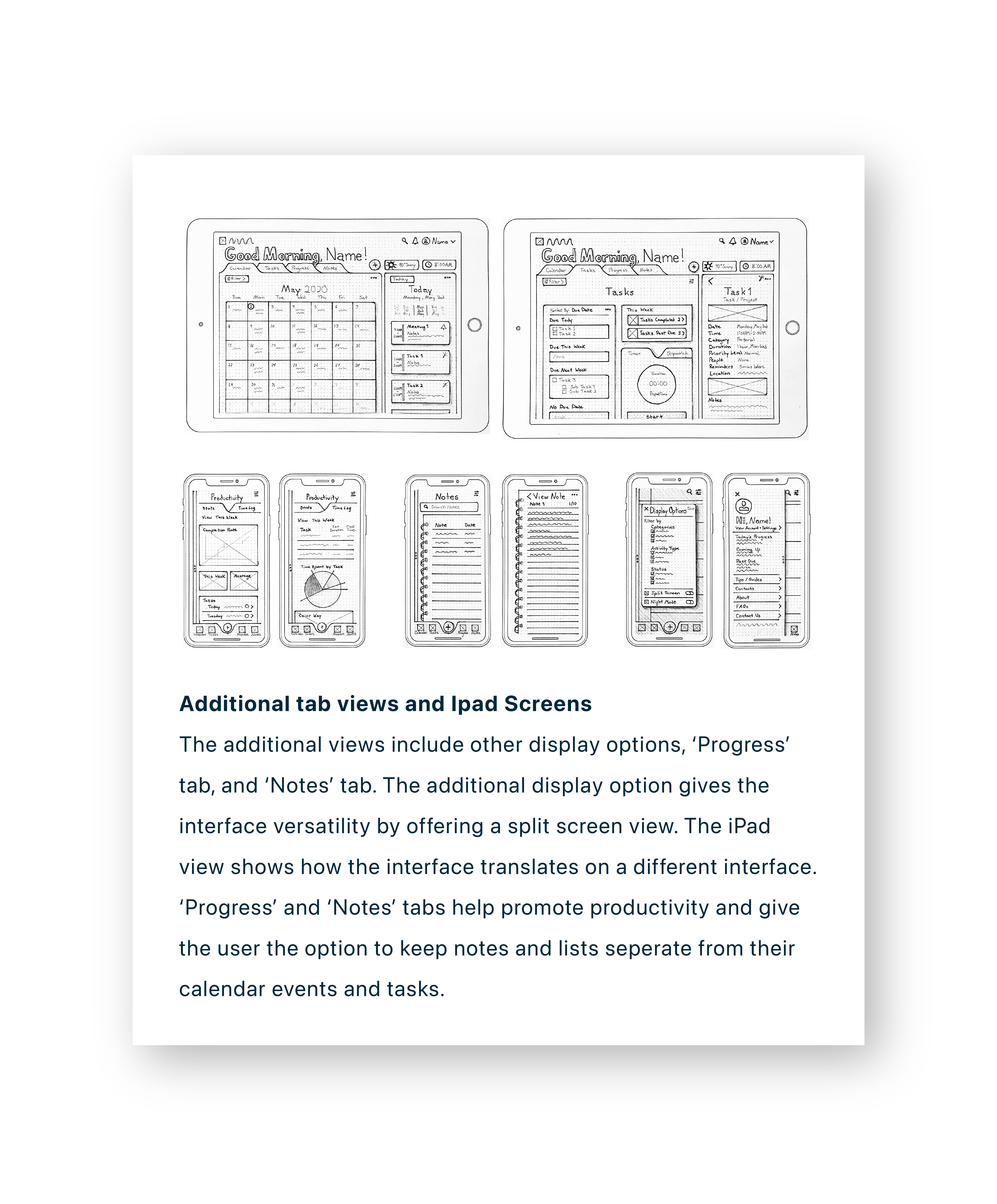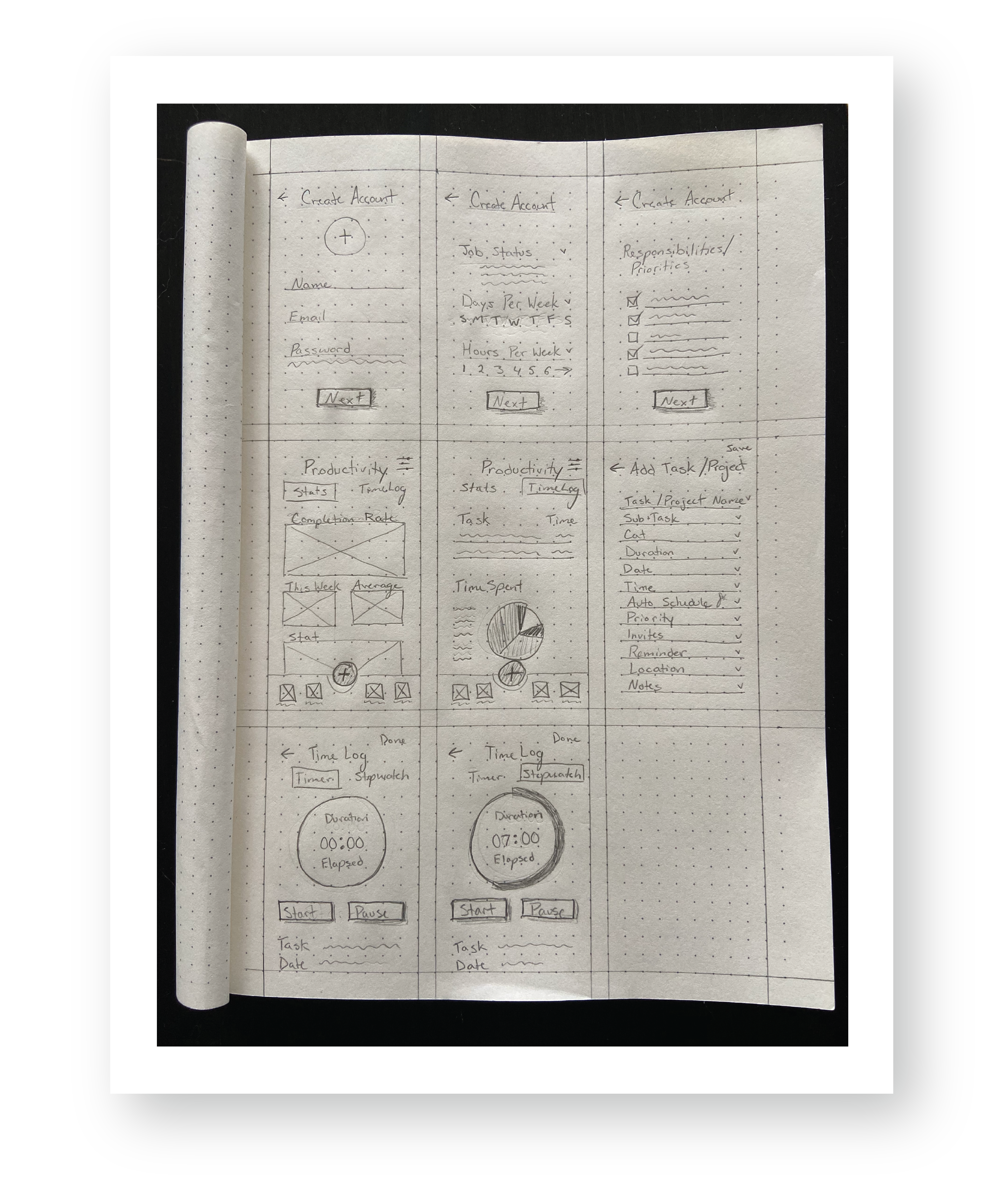 I sketched ideas around a scheduling application that uses AI to personalize the users' experience. I made sure to include a mix of features that users are familiar with and innovative ways to track and help productivity. A few ideas I chose to explore were: