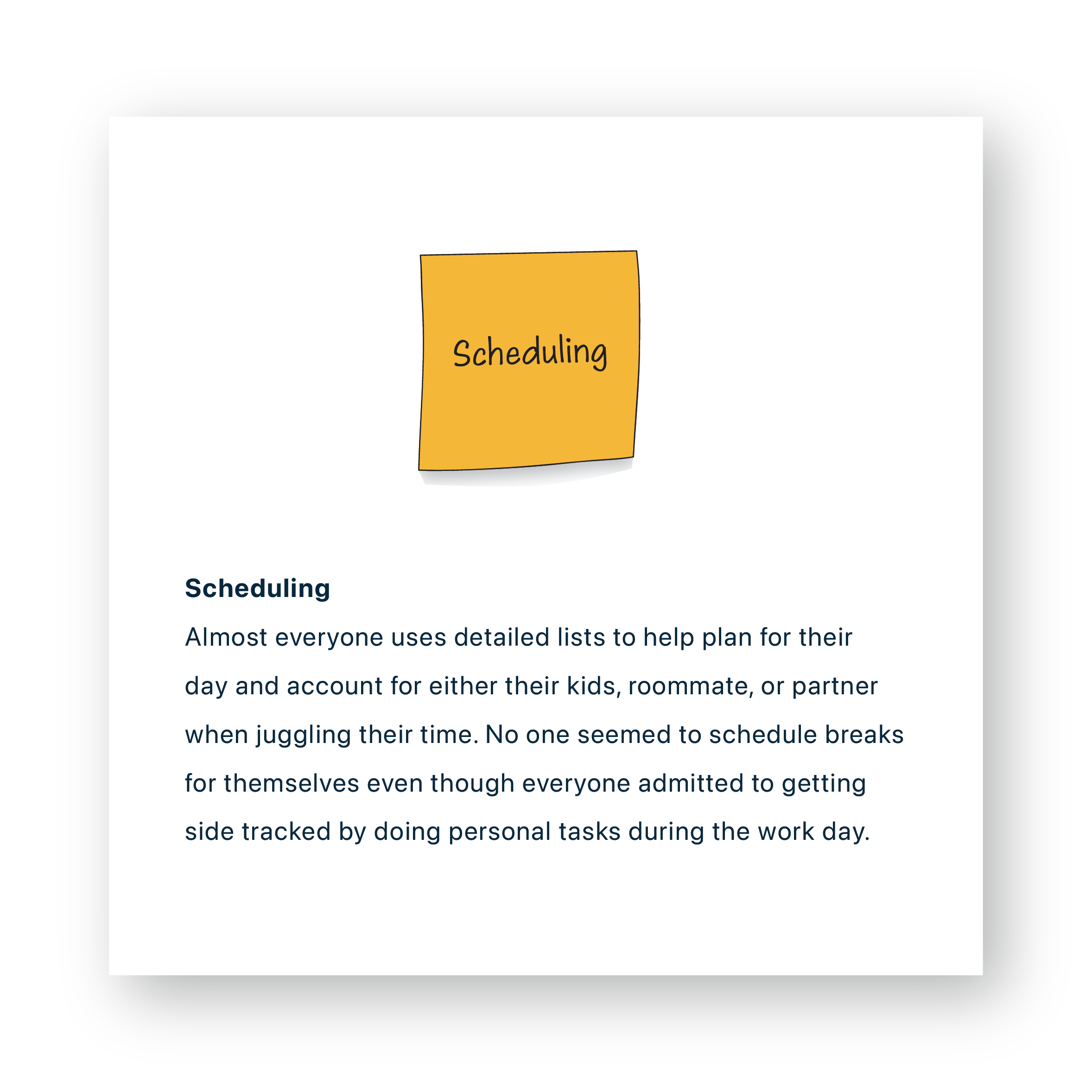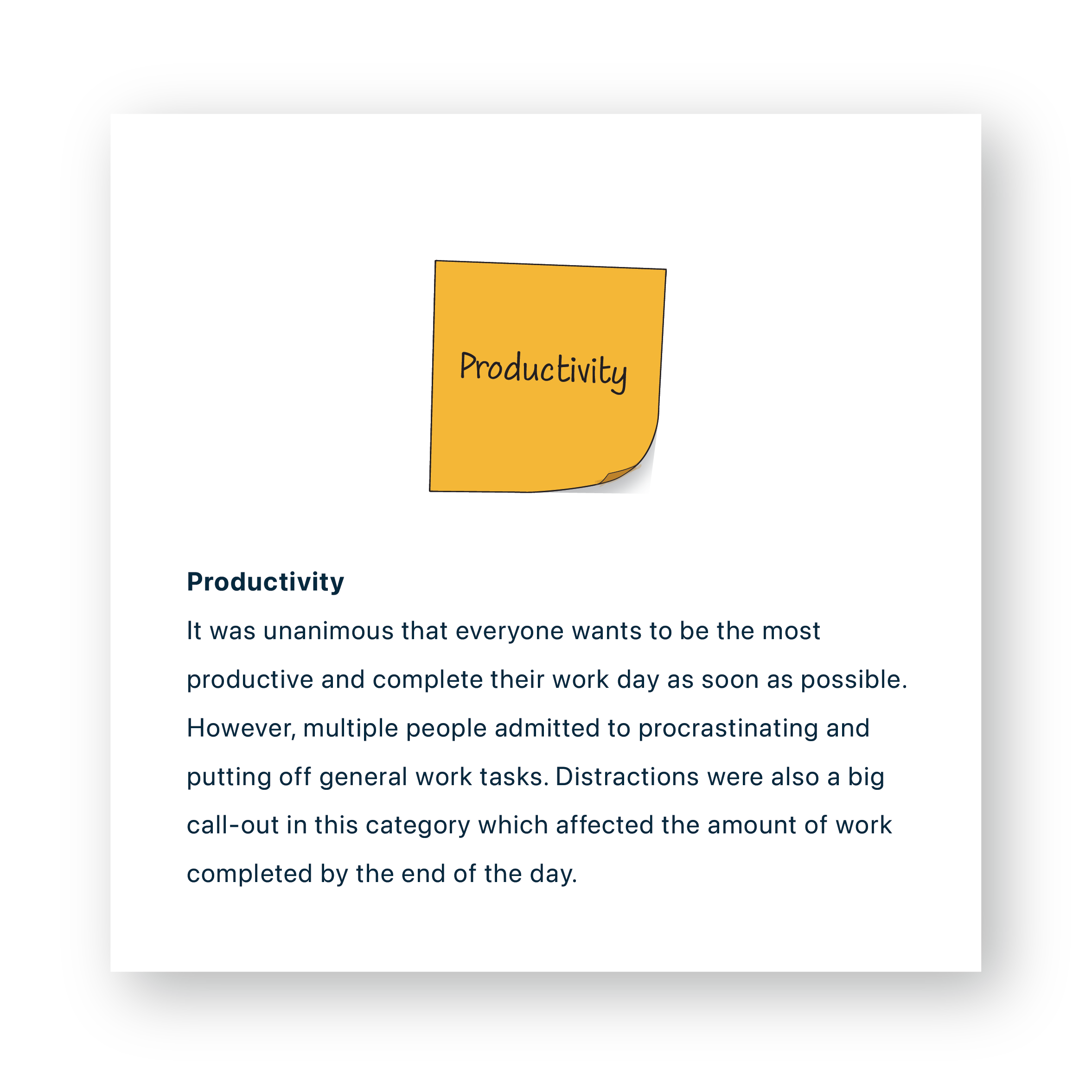 I originally focused my problem space around remote work life because of the difficulties that arise solely based off workplace arrangements. However, I realized that any employee – regardless of location – can become consumed with work and neglect their personal life and well-being. It is my hope that this app will benefit more than just the employee working from home, but anyone trying to increase productivity, be organized, and find balance in their life.