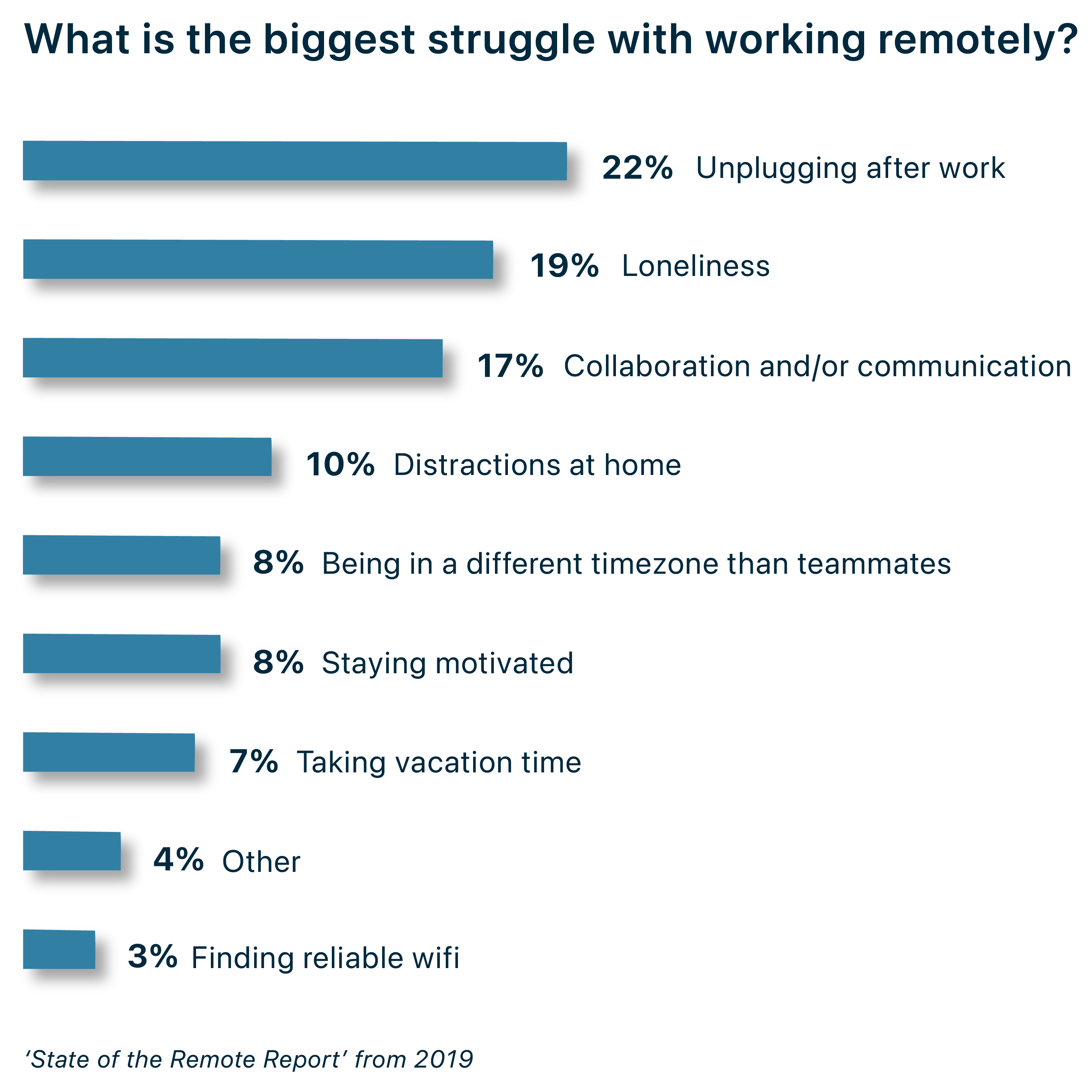 In the study shown to the right, the majority of people said 'Unplugging after work' was the biggest struggle they face while working remotely. This could be caused by a number of reasons, such as not setting boundaries or having poor time management.